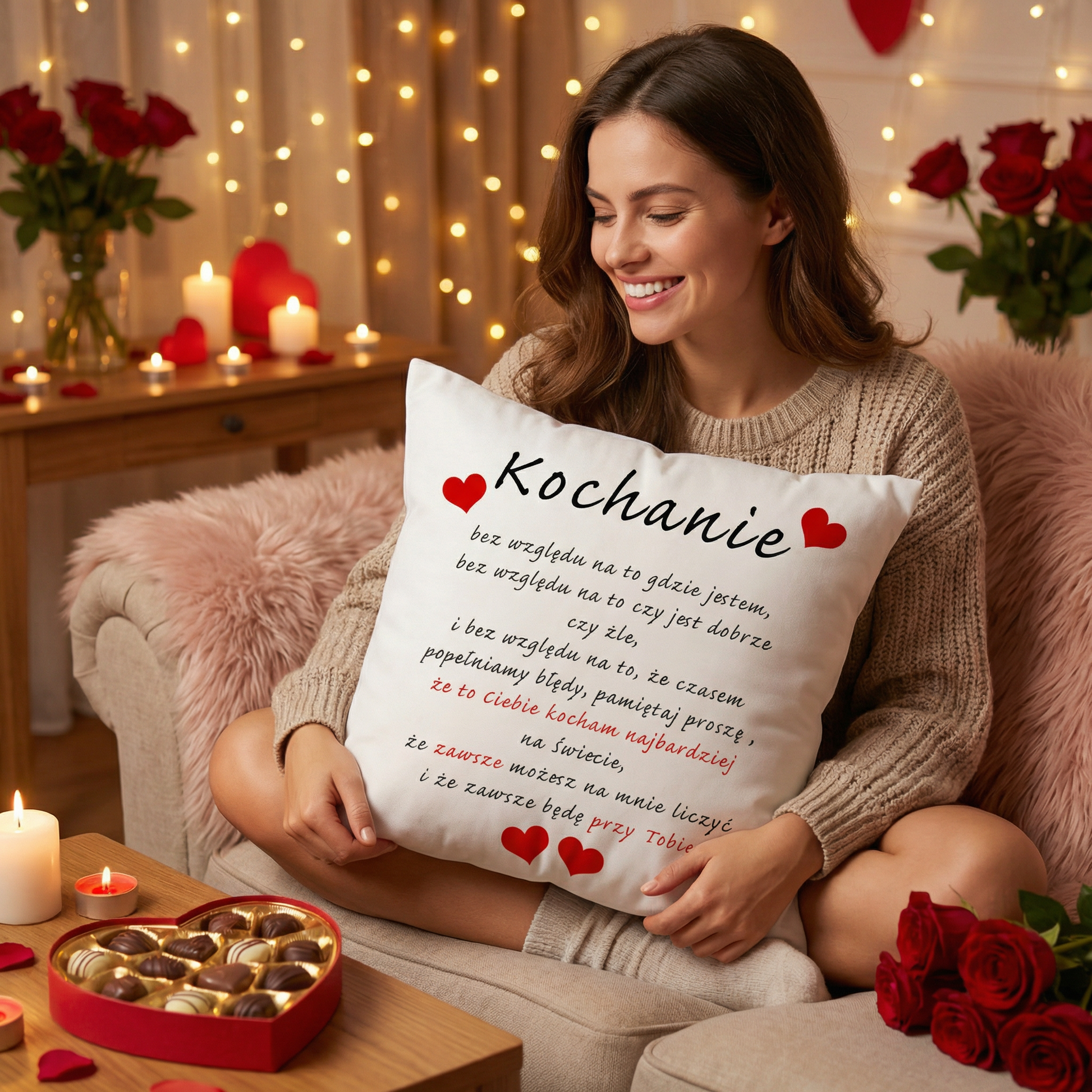 Nie zawsze potrafimy powiedzieć wszystko na głos. Poduszka walentynkowa „Kochanie” z pięknym, wzruszającym tekstem to wyjątkowy sposób, aby wyrazić miłość, wsparcie i bliskość. To idealny prezent na Walentynki dla osoby, która jest dla Ciebie najważniejsza.