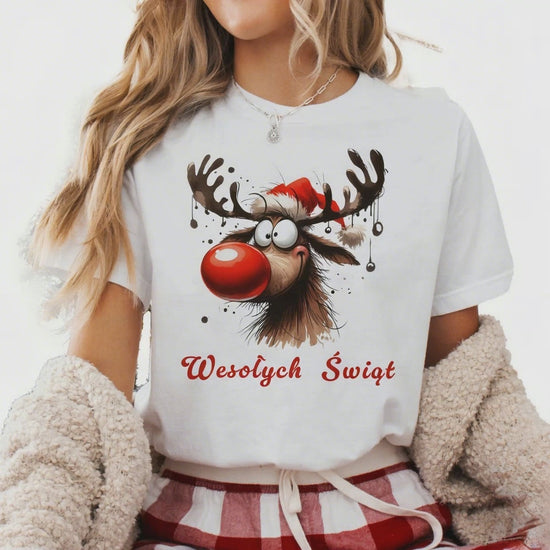Koszulka Świąteczna "Wesołych Świąt" z Twarzą Renifera - Idealna na Boże Narodzenie!
